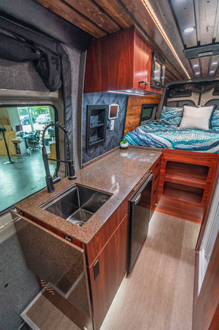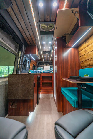front swivel seats - bench seat - hidden toilet - lounge space - walk-in shower - wardrobe - overhead cabinetry - king-ish size bed - full-use kitchen garage - tons of other features!